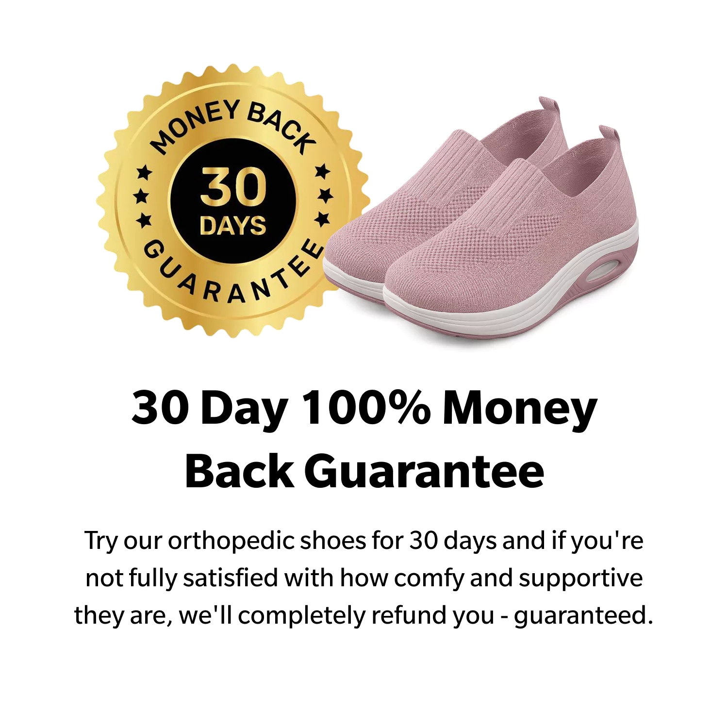 Try our orthopedic shoes for 30 days and if you're not fully satisfied with how comfy and supportive they are, we'll completely refund you - guaranteed. In fact, if you're unsatisfied with anything at all within the first 30 days, contact us and we'll send you every single penny back right away - no questions asked & no hassle.